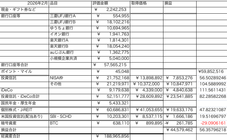 2026年2月時点での資産一覧:18,897万円(先月比+849万円)